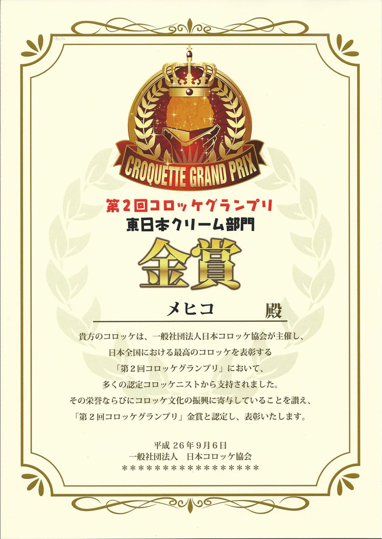 一般社団法人 日本コロッケ協会様より2年連続で金賞を頂きました!